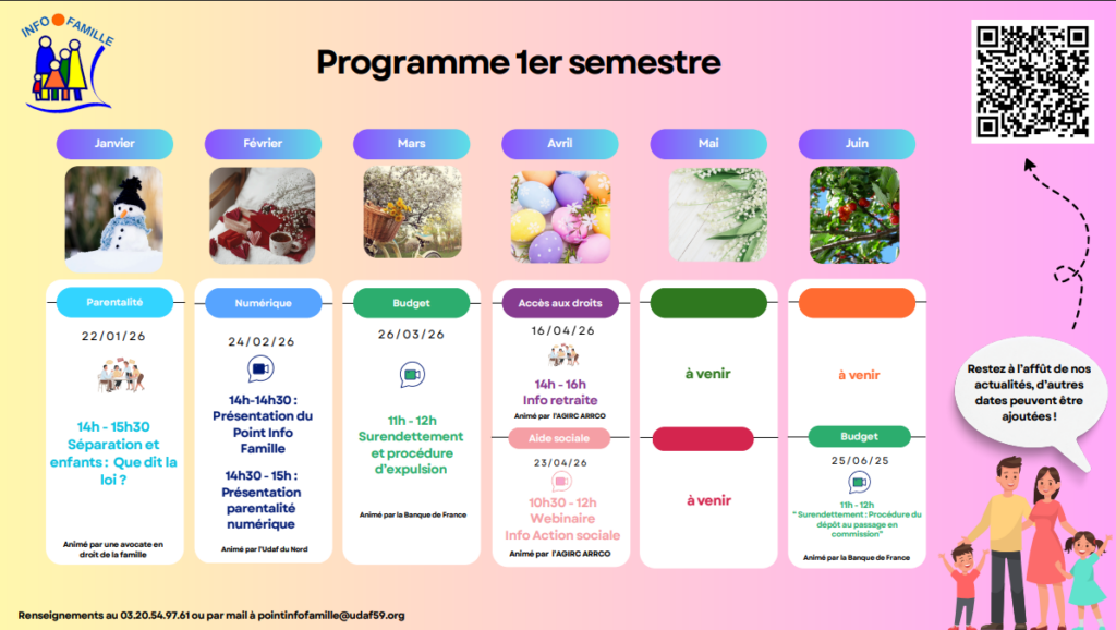 Le Point Info Famille Lille-Métropole vous invite à raison d’une fois par mois minimum, à participer à un temps collectif autour d’une thématique ou dispositif touchant la sphère familiale (logement, emploi, petite enfance, séniors, budget…).