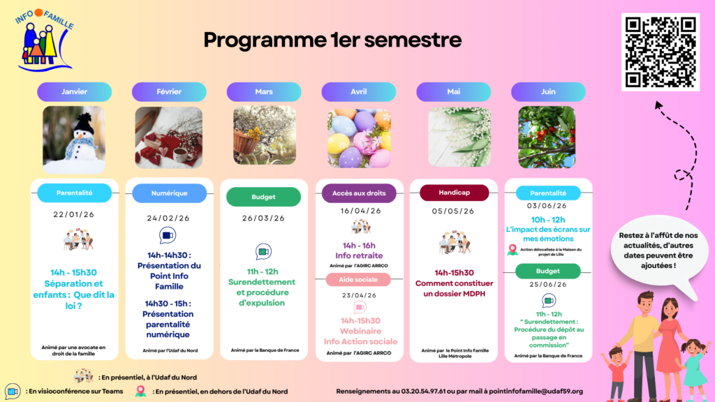 Le Point Info Famille organise tous les mois des temps collectifs nommés « les rendez-vous du PIF » portant sur différentes thématiques familiales (logement, emploi, petite enfance, séniors, budget, parentalité…). Ils se déroulent en présentiel dans les locaux de l’Udaf du Nord ou en visioconférence.